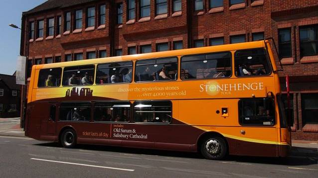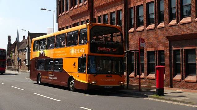 尽管酒店服务员已经讲得很清楚了,其实我们是半信半疑的。因为在网上我曾经看到有中国朋友介绍,从巴士总站有3路公交车可以开往巨石阵。心想,公交车是否可以便宜点呢。于是我们先去了位于城市中心的公交总站。在公交总站看到有两位司乘工作人员正站在路边说话,于是我们就过去问去巨石阵的3路公交车站在哪里。他们告诉我们,现在已经没有去巨石阵的普通公交车了,如果想去看巨石阵必须做那个旅游大巴专线车。其中的一位工作人员,主动提出带我们去车站。告诉我们旅游专线的车票是每人28英镑。
