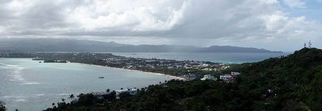 这是从观景台拍的长滩岛全景照,左面是布拉波海滩,右面是白沙滩,远处是菲律宾的卡迪克兰码头。