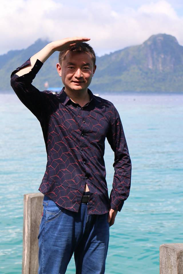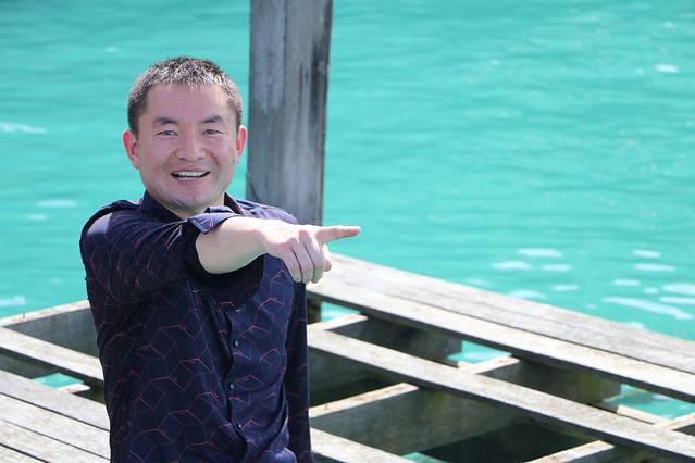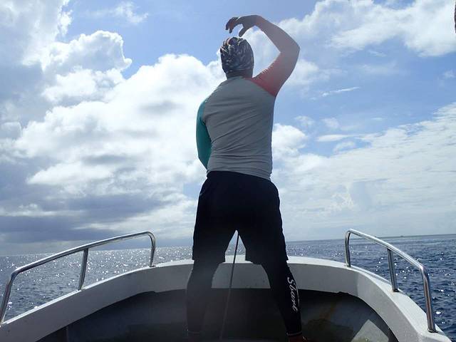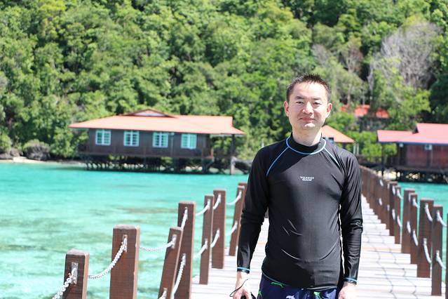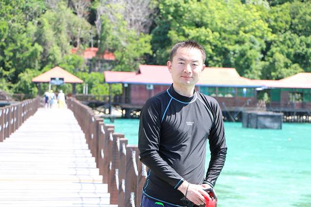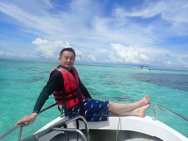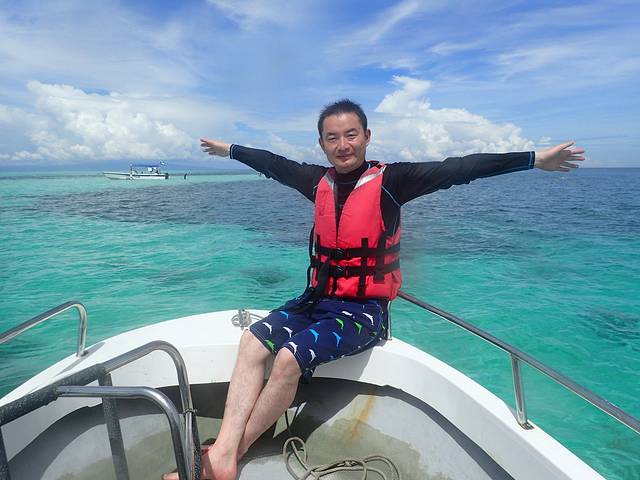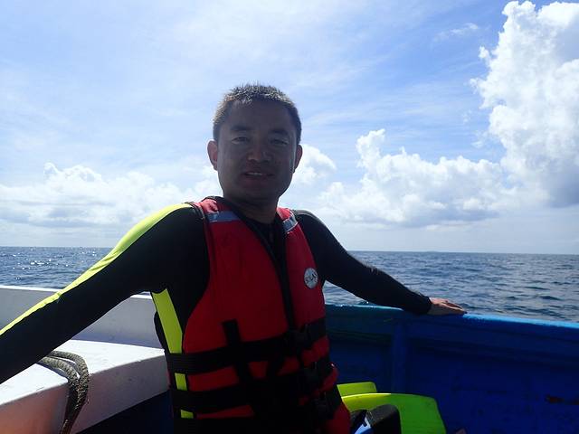 第二天早上,吃完早餐,阿忠来接我到潜店,终于见到了“什么鬼的阿忠”,认识阿忠是在2016年10月,当时他刚从福建寻根回到马来,他很忙,朋友圈天天刷屏,每天带游客去海岛各种玩各种装逼,我感到他所在的这家Sipadan Dive Center很受大家欢迎。阿忠是潜店最出名的向导,因为他真诚、幽默、负责、多才多艺,特别受美女游客们的喜爱,果然今天一日游船上只有我一个男游客。我逗他,他说我也不知道啊,我的客人基本都是女的。今天阿忠带我们出海,这也是在仙本那唯一他带我出海的一天,他太忙了,不仅要做旅游还要搞摄影有时还亲自往返斗湖机场接送客人,之后的这几天他带他的一位深圳的模特朋友去岛上拍写真。