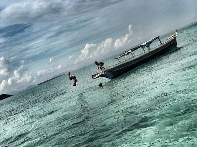 当我们的船开到他们的木屋周围慢慢停下时,一群孩子或划船或游泳朝着我们的船过来时,顿时大家都像例行公事一样拿出给孩子们准备好的糖果饼干等零食,有的在拍照,有的散发零食,连我们的潜导和向导都开玩笑地伸手跟我们要零食。此时此刻,之前见过照片上的那些巴瑶族小孩好像突然从凝固的照片中活生生地出现在我眼前,有种梦幻的感觉,自己是不是在做梦。当伸出手的孩子们在得到一些零食后,有的甚至只拿到一片饼干就转身回去,一点点东西就得到满足并没有那么贪婪,心疼这样的孩子,尤其忘不了两次看到几个小孩为我们表演跳水的那一瞬间,还有这张照片上那个脸上涂了椰粉(巴瑶族天然的化妆品,椰肉晒干磨成粉可以美容)的小女孩,我想给她拍照,她离我有点远好几次摆出姿势配合我然后手一直伸向我,而我已经没有什么东西给她了,就这样短暂的停留后我们离开了,永远都忘不了那一刻,有种被感动的感觉。感概自己的生活是多么幸福,看到世界的另一边,如此美丽的海上还有那么一群人过着没有电灯没有手机没有网络艰辛的生活,别人给一点吃的就开心的不得了,无欲无争地在我们看来的仙境生活着,他们的生活确实很幸苦!纯净的仙本那,有最美丽的童话,最纯真的孩子。