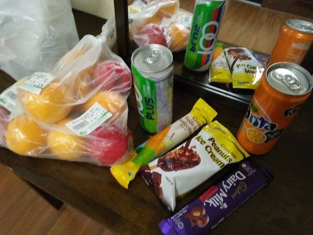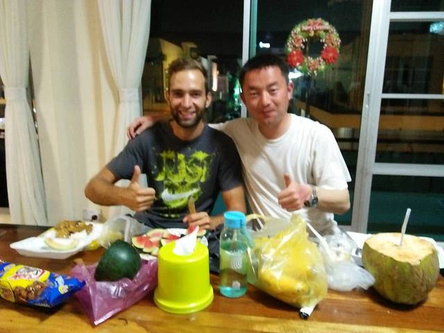 在仙本那的第三晚买了烤鱼、盒饭、水果、甜点,德国朋友和我一样也买回来一起吃
