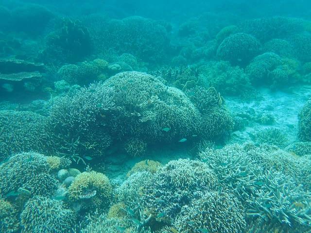 在曼达布湾的海里,可以看到各种颜色形状的珊瑚和海胆海星小鱼等生物,不过有些珊瑚已经死了。