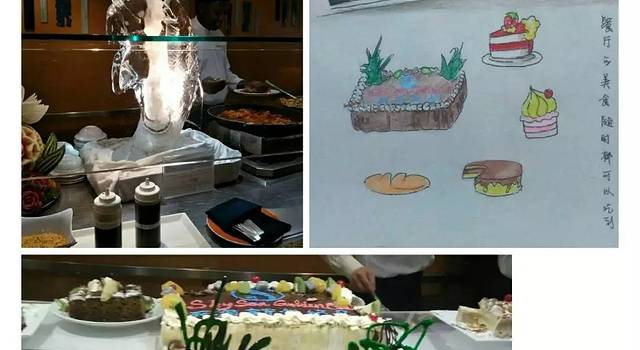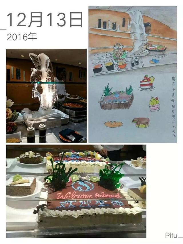 各种好吃的呈现在眼前,中餐、西餐、各种特色菜更是琳琅满目。特别是一个蛋糕上写着“欢迎登船”看上去就让人感觉暖暖的......