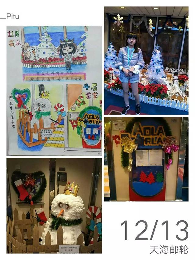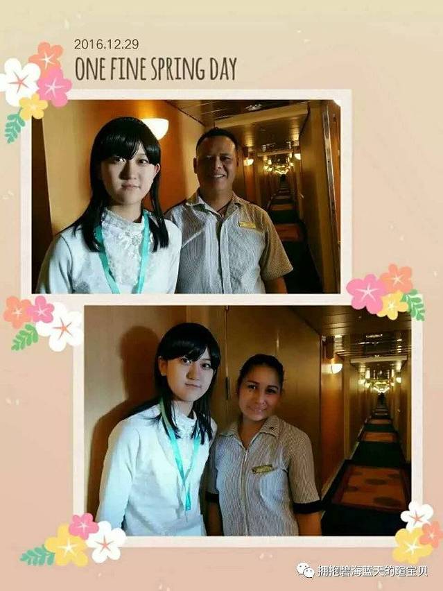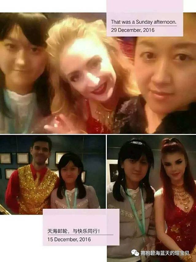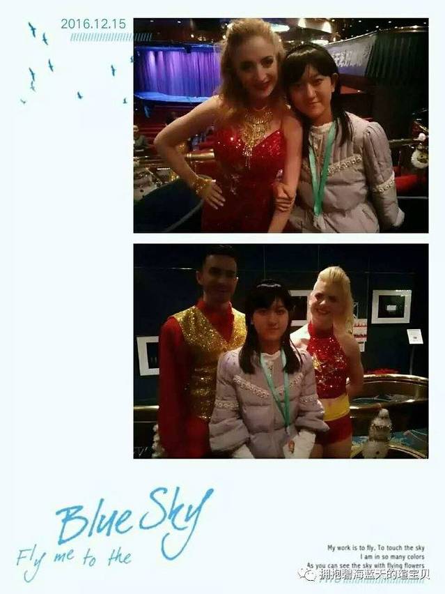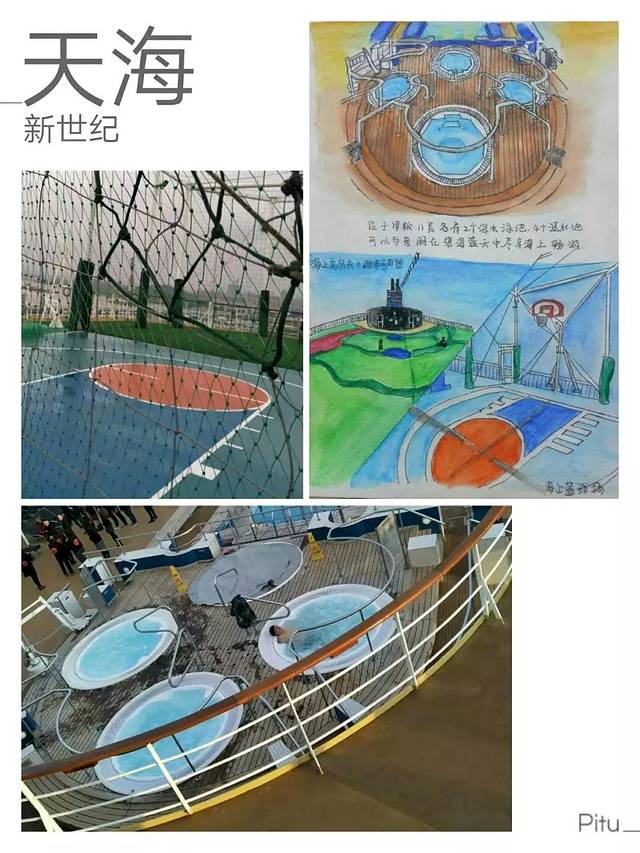 上船时真的是感觉特别震撼,欧式风格的内部构造,并且提供游客可以购买到世界名牌商品的免税店;干净素雅的三人海景房,为等客人到房间就已托运到了门口的行李摆放的十分整齐,沉静无边的长廊仿佛没有尽头,我们住在4017房间推门而入正前方床头柜上摆着一盏漆的黝黑发亮的台灯,台灯上方有一扇窗,窗子外便是大海,忙乱过后,你就便会体会到其中的节奏,那便是大海平静的心,房间右侧还有幅很抽象的画作更是为房间添加了点缀的作用,房间里的桌子上有着工作人员准备好的今日节目单和备忘录,邮轮每一个时间段都有不同的活动,我将在这六天中本来跑去根本不会在房间安静的坐一会儿,晚上就算拖着疲惫的身体也会想着今天的种种盼着明天的到来,桌子的正前方有着一个特别大的镜子保险柜就藏在镜子后面(藏的也真是够隐蔽的知道最后两天我才发现)房间里各种生活用品配备齐全当然电视是有的啦,上船当天前大约两个小时是在播出消防逃生视频当然每个房间的救生衣也是必不可少的消防演习分AB的A是在海上冰吧,我们是B所以在魔都剧院听工作人员讲述逃生要点;当然在其他时段房间电视是会播出例如说电影或者邮轮咨询什么的;说起邮轮美食我最喜欢丽都咖啡厅(自助餐厅)的餐品,我认为这样可以更加随意一点喜欢什么夹什么,据说在天海邮轮上一天可以吃10顿饭,我下决心要试一下可还是没做到。在邮轮上我可以说去过最多次数多就是丽都,我还有两个外国朋友都是在丽都认识的NACKCLAY(拉克雷),LAXMAN(西曼)真是巧了他们同样都是印度人,同样也帮助我很多;甲板也很漂亮我特别喜欢吹着海风看着大海的感觉,特别惬意。夹板上还有游泳池、高尔夫球场等... ...(就不一一列举了),每天晚上都会去魔都剧院观看来自世界各地的精彩演出,踏上自己的舞台,感受霓虹灯的照耀,观众欢呼掌声是他们前进的方向,来自新西兰企鹅先生~杰瑞米的杂耍特别的有趣,一次杂耍课堂我的妈妈也和他有小小的互动学了一些皮毛;有一大咖居然和我们同一船期踏上新世纪号,他是中国好声音高洋在这船期的天海邮轮好声音挑赞赛充当评委并且现场献唱《花房姑娘》等;临近圣诞邮轮中更是布置了圣诞主题的装饰品都特别漂亮,真的非常感谢天海邮轮和工作人员若不是你们辛勤的工作,如何换来我们舒适的海上生活环境?谢谢你们让我有一种宾至如归的感觉,有机会下次再见!