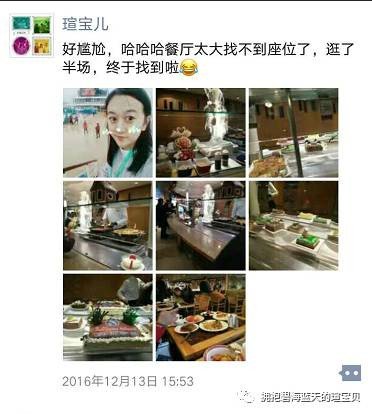 爸爸、妈妈拿好了东西找到位置已经坐好了,我还要去拿自己喜欢的甜点,可能是餐厅太大,居然迷路了,还好有手机和妈妈微信,最后找到了位置,爸爸说以为我去后厨帮忙了呢。呵呵....