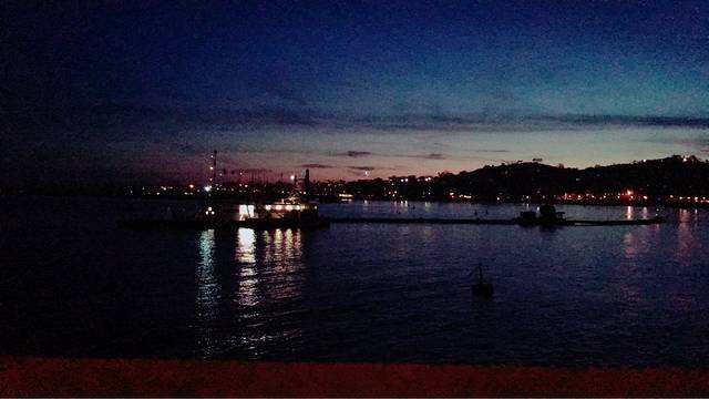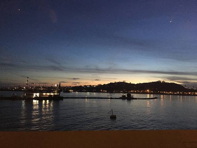 因为坐在栈台一侧的饭店里,可以很安心地透过窗玻璃欣赏夕阳。看着天空一点一点暗沉,暮色下华灯初上,美得沉醉