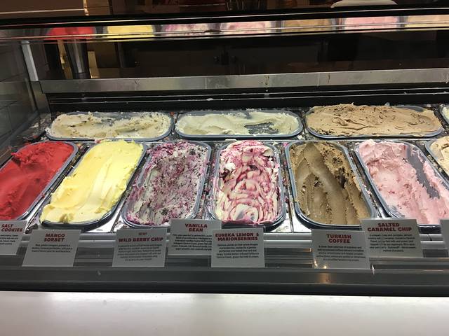 这是SB 市中心最有名的一家冰激凌,排队会到门外还拐弯儿的那种!但口味特别多,加上新奇的命名法,我几乎每种都想尝