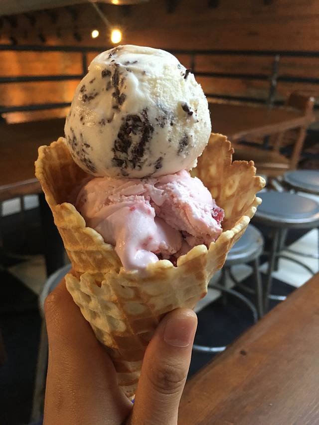 最后点了双球的草莓+chocolate chips,浓浓的奶味配水果的清新!嗯没白排😏