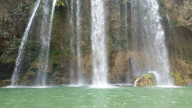 这是一个三级台阶式瀑布,每级间距离约30米,总高度为80多米。河水奔泻而下象白帘飞挂,冲击而腾飞的水珠似云雾弥漫,配上两岸青翠的树木构成一幅瑰丽多姿的画面。