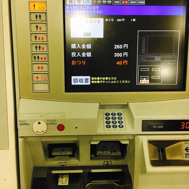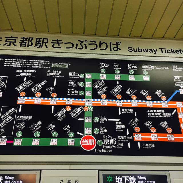 举个例子 这是在京都的时候 我要去北大路站(离民宿最近的一站)绿色的南北向最上面的那站,此时我在京都站。准备好钱,先找到【北大路】站的票价(在站名下面 黑色的是成人票价 红色的是儿童票价) 在机器上投币 你的票和找零就会出来啦
