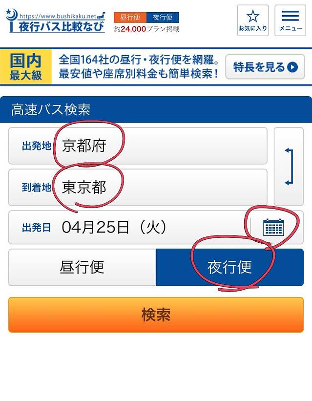 打开网站后选择你要的出发地、到达地、日期和白天的车还是晚上的车。(想做夜行巴士就选择【夜行便】)然后点击搜索