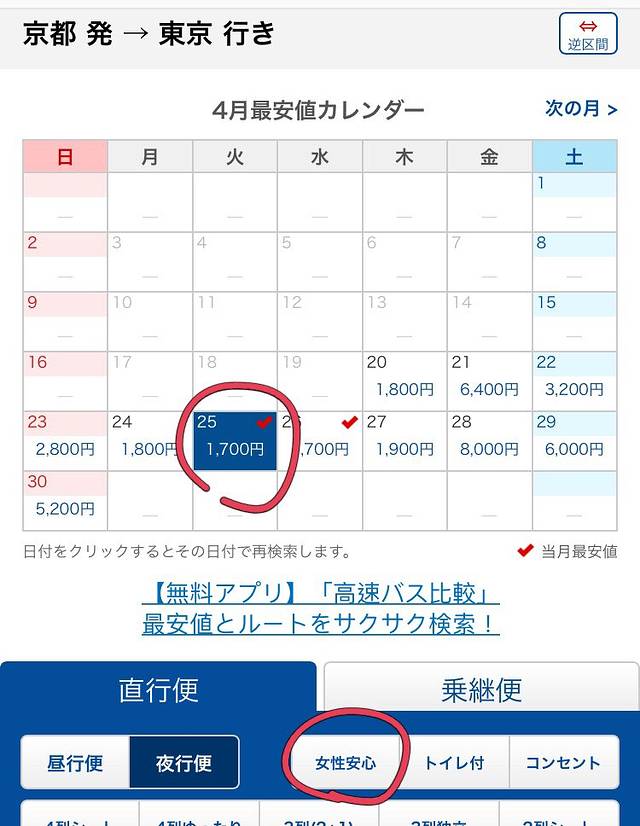 接着你可以看到不同日期的价格,下面有个“女性安心”适合独自出行的女性是只有女性的车厢,可以按需要勾选。(不过我本来想选择这个但是后来没订上实际乘坐的时候发现其实没必要太担心车上人都坐不满,安全问题不用担心的,但不排除意外情况哈)