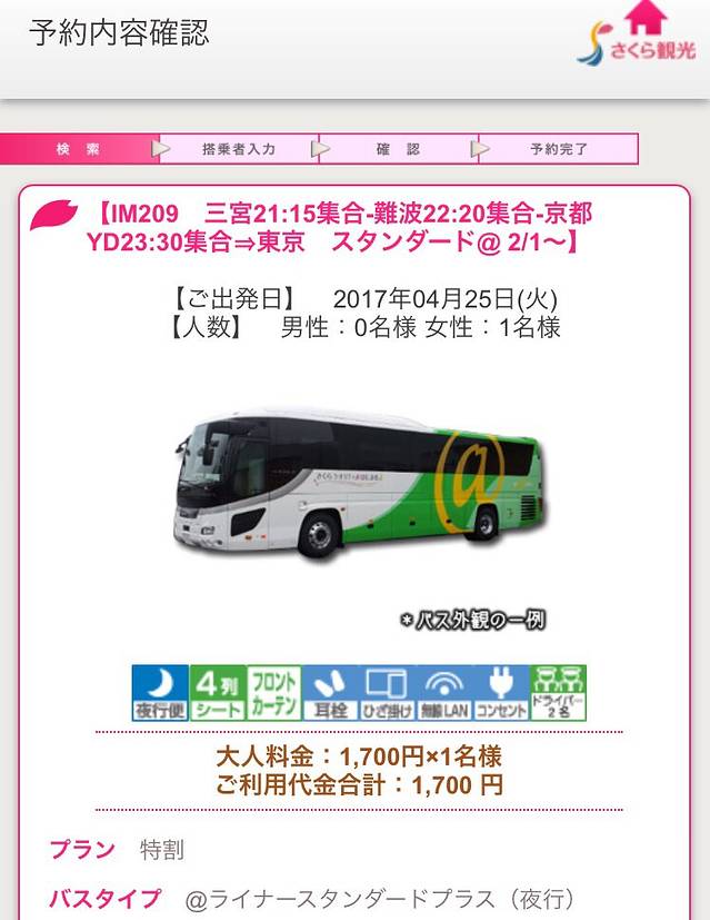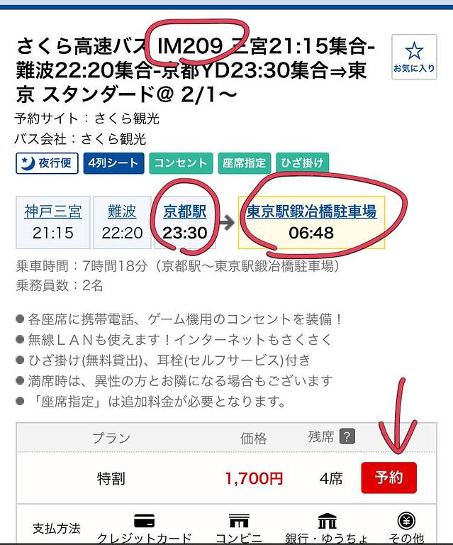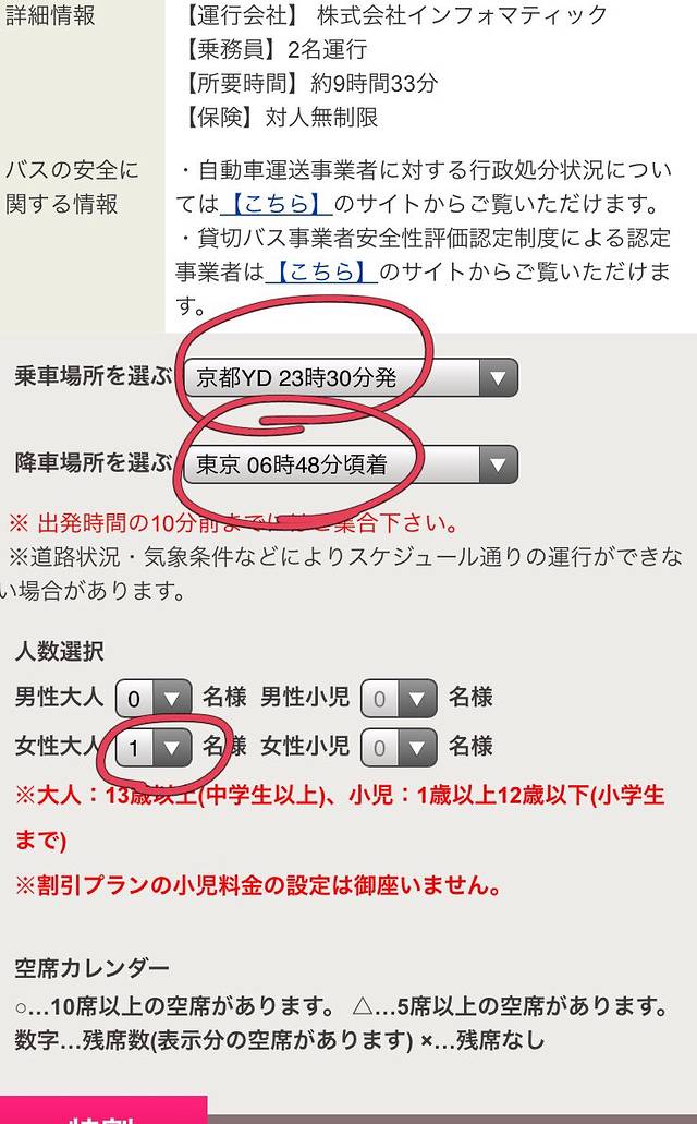这里要特别选择一下“出发站”和“到达站”,因为你的起始站和终点站可能只是这班巴士的经停站(比如我当时坐的那班巴士就是大阪--京都--东京,而我是京都--东京,相当于是半路上的车)所以订票时在这个地方确认好告诉人家你从哪里上车到哪下车