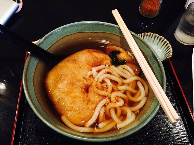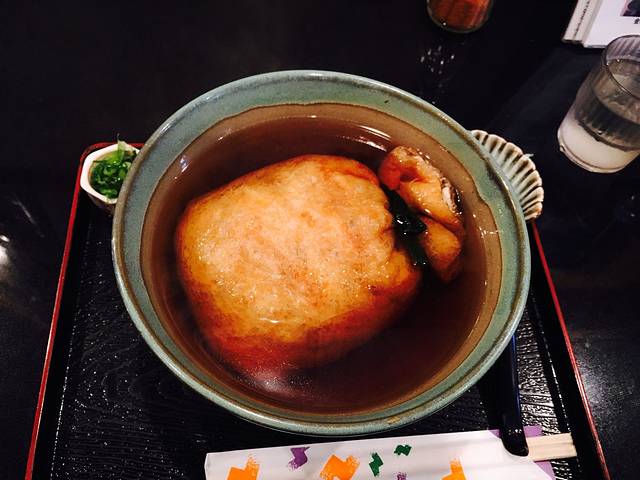 装在(豆腐做的)袋子里面的乌冬面~吃的时候把豆腐皮戳破 挑出里面的面条热腾温暖的乌冬面与汤汁融合在一起 简直美味 怪不得是需要排队的店 店不大 我比较幸运并没有等候太长的时间