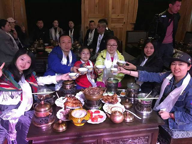 我们这个小团的所有成员的唯一合照,端起酥油茶,实在喝不下呀。默默的喝了一丢丢青稞酒,相当的烈呀,48度吧,不过余味却很香,烈性没那么持久。
