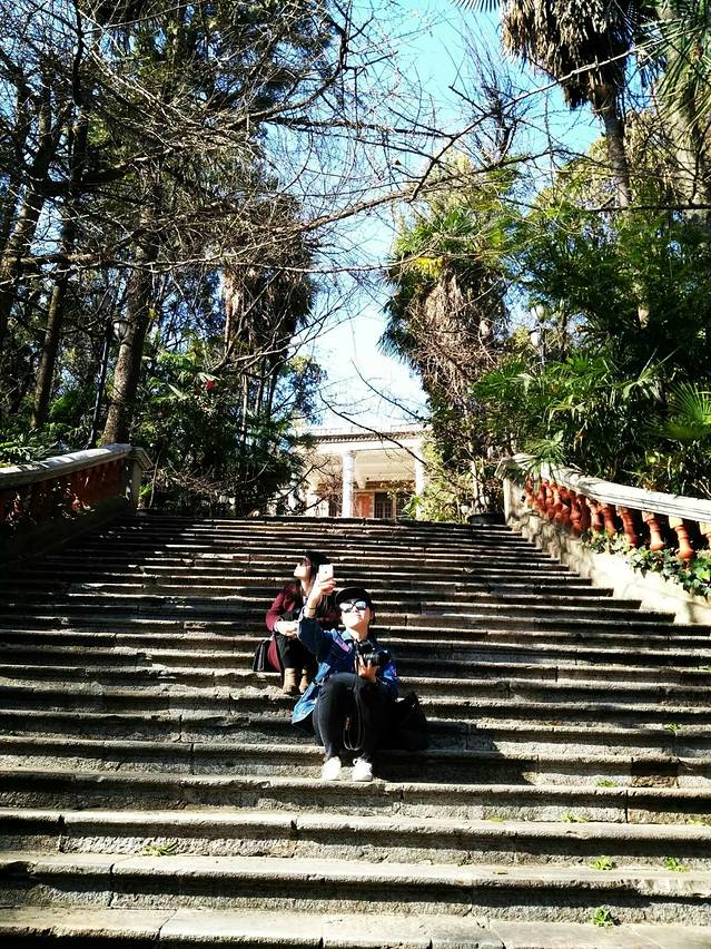 楼梯很陡,所以中途我们需要小休息一下。本身坐得没这么没素质的啦。因为有人帮忙拍照,所以摆POSE的啦。