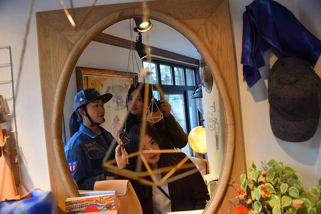 没人路过帮拍合照,正好我看那装饰品,希希照镜子,丫丫路过时,三人来了一张合影