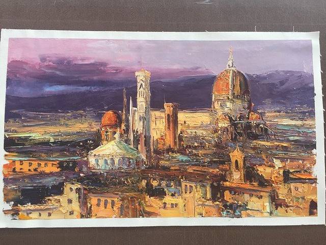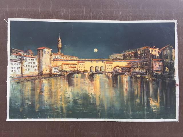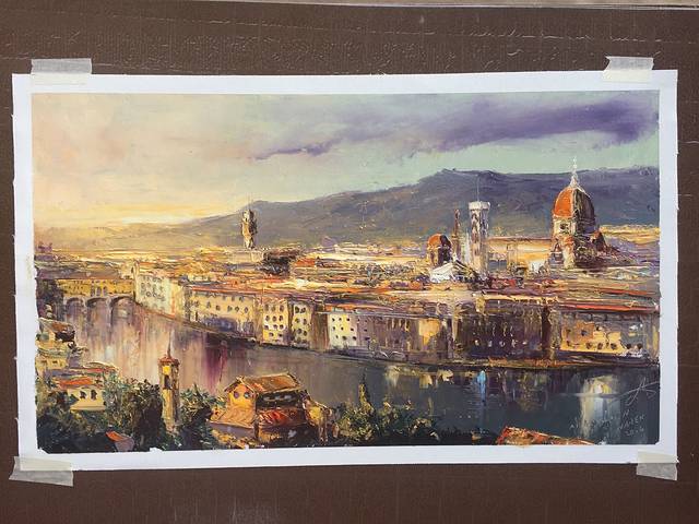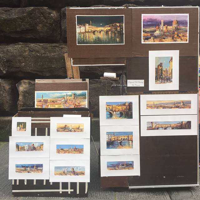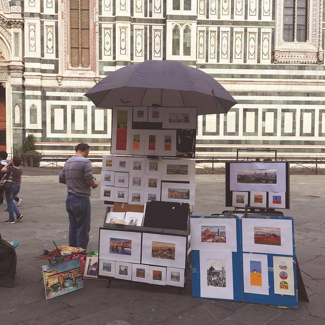 在这里我得特意说一下关于我在大街上买画的事,我自己是一个画画的,所以我基本上是不会花钱再买画上的,但是走到这位大叔的小摊位前实在是就再也走不动了,我在这和他聊了很久很久,看上了好几幅他的画,他的英语不好也不会法语,我又不会意大利语,我们只能简短的交流一下价格,但我的状态一直特别兴奋,他也完全感觉到了我对他作品的崇拜和喜爱。在河边和教堂周围有很多这些街头艺术家,我都大概看了一下可是最让我有感觉的就是他的画,我其实是想买三副的,但是我怕拿回国被折坏,再加上如果全买下来价格也确实太高了,我就最后只买了一副小小的作为留念。