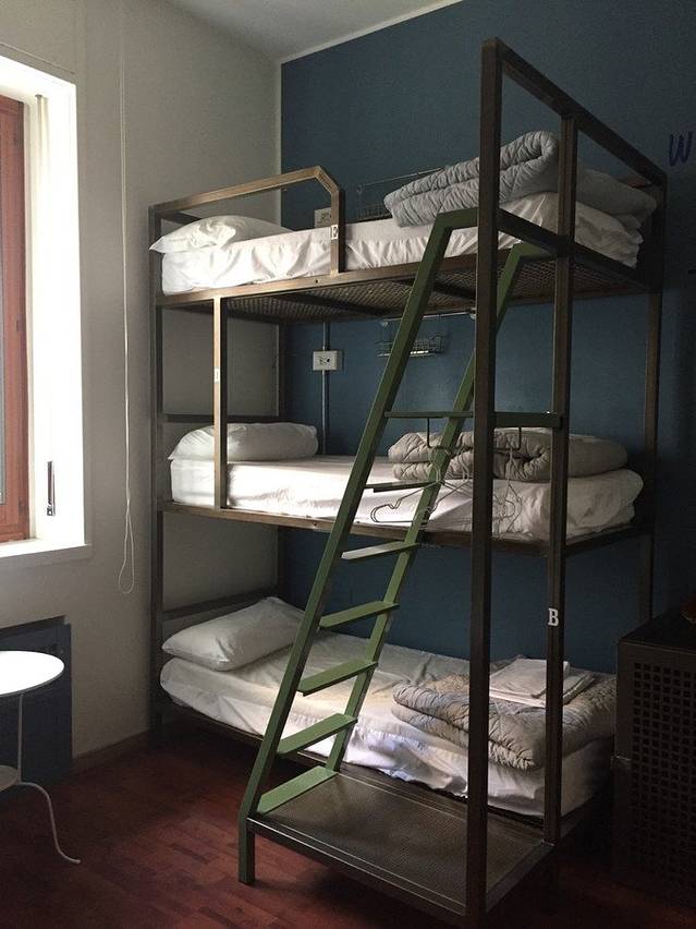 在米兰的青旅是之前就定好的,叫ostel bello。这家青旅总体来讲是很不错的,虽然价格不便宜,但是性价比还是比较高的,因为整个欧洲的青旅都不便宜,我在这里订了三个晚上,本来还担心晕头转向的不好找,但是在这里告诉大家,这家青旅就是除了米兰火车站旁边没多远就到了,特别特别方便,地铁站也是这一站,去大教堂或者干嘛的都挺方便。我到达的时候店员说房间还没有准备好让我等一会,我当时觉得都晕成这样了其实只想躺床上睡一会,没想到下午三点了还得等,好在楼下就有各种咖啡可以喝还有小吧台卖酒,店员给了我一个小瓶盖,是可以拿他换一杯随意的咖啡或饮料的,我就换了一杯咖啡坐在楼下等着,后来他们通知我的房间好了,就把我送到房间。房间在二楼,一个屋子五个人,我的床号是E,结果我一看,我的床位就是最高的那个!我第一反应就是,are you fuckin kidding me man?