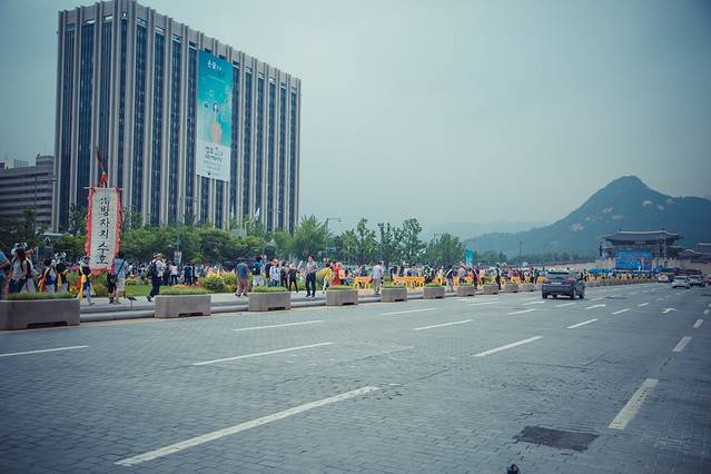 等我们参观完成走出了光化门,本以为示威的人还会在,没想到走到广场上发现昨天的示威好像凭空消失一样,广场两边已经恢复了原貌,两边变成了普通的小摊贩,卖些纪念品、日用品之类的东西。