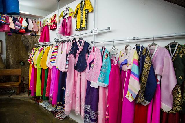 因为是韩国传统建筑群的关系,这里有不少韩服租赁的店面,在刚刚抵达村子附近的时候,就已经可以发现不少穿着韩服的游客们,当时我告诉肖总,我是不会穿这个的,感觉好奇怪。。。