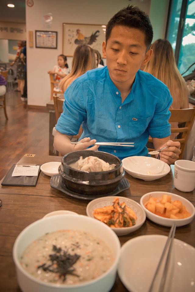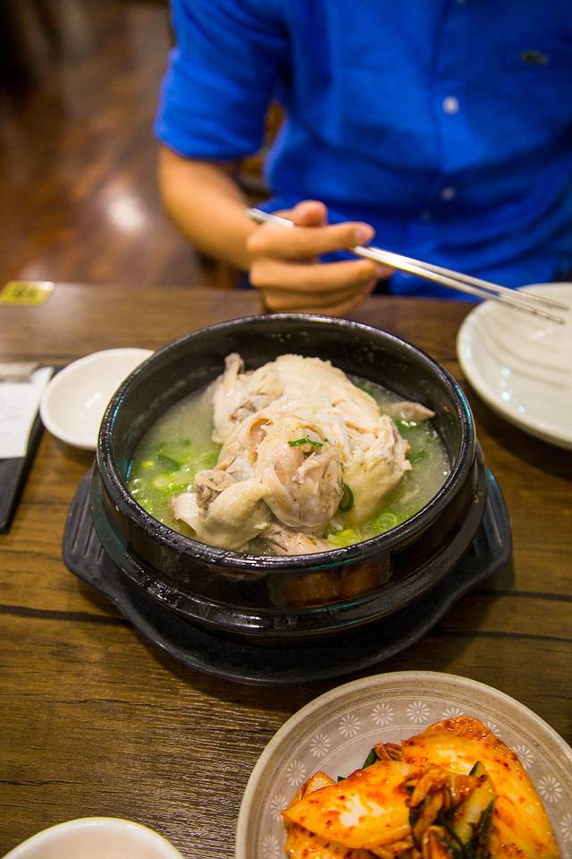 参鸡汤味道鲜美,整只鸡窝在锅里,肚子里放了米饭,肉质鲜嫩,一勺下去,鸡汤包裹着鸡肉、鸡肉搭配着米饭,相辅相成,中间间歇性搭配辣白菜解腻,完美