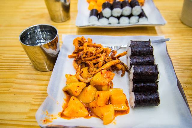 最后我俩走进一个饭团店,明洞上面我就看到了有两家店面,按位收费,一位给10个小饭团,辣鱿鱼和萝卜无限添加。味道非常不错,挺适合塞塞牙缝的。