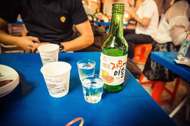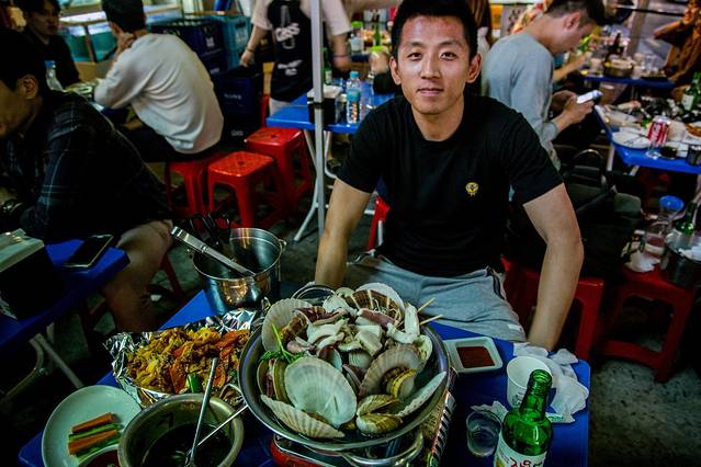 奇迹般的是,路痴的我竟然顺利带着肖总找到了这家店。更重要的是,这家店里有个中国的服务员小哥。小哥看见祖国的亲人特别亲切,不过我想他应该经常可以看到祖国亲人呀。。。不管这些,小哥热情给我们推荐了店家的招牌菜,辣炒鸡脚,海鲜锅,柚子味烧酒,经过二次品尝,味道绝对还是一级棒。但在这里吃饭最最重要的还是这个韩剧式的大棚子里坐满了韩国的男男女女们,一种特别接地气的感觉,偶尔还能听懂几个词,顺便和肖总显摆显摆。这里一般都会开到凌晨5点,后半夜会更热闹。