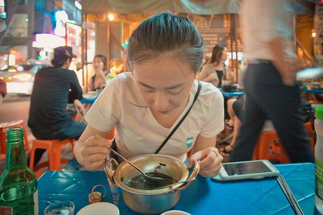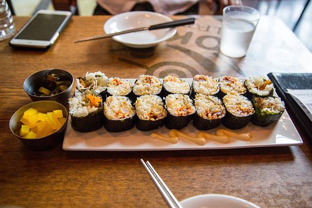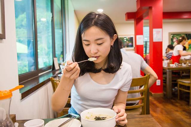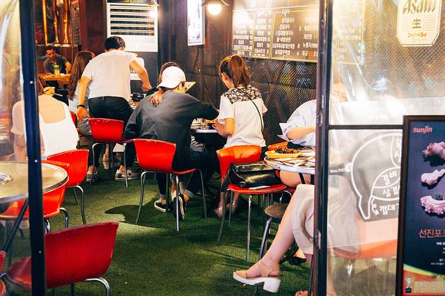 我们吃着吃着,旁边的一个男生桌边走来几个女生,叽里呱啦叽里呱啦的一大堆后,他们找了个更大的桌子去坐,我跟肖总正在猜测他们是什么关系的时候,中国小哥默默走到我们身边,解说道:“他们互相都不认识的,那几个女生邀请男生们去一起坐。。。是不是很奇怪,他们韩国人都是这样的,吃着吃着就变一桌啦”。。。可是,小哥,你要不要这么贴心啊。。。!!