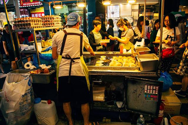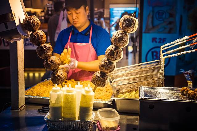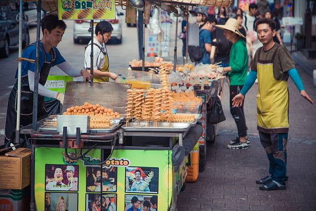 明洞街道除了两旁各种店面,中间的道路上还有各式各样的小吃摊位,一直没进食的我俩一路的咽口水。