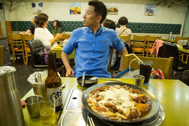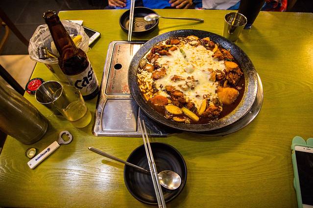 梨大的游览差不多1个小时就可以结束,虽然校园很美,不过毕竟是别人家的校园,加上肚子在打鼓抗议,就在梨大旁边找到一家平价不错的芝士铁板鸡,结果味道相当惊艳,鸡肉嫩极,芝士香浓,搭配上一瓶cass啤酒,真是只有满满的热量才能带来身心的满足啊。