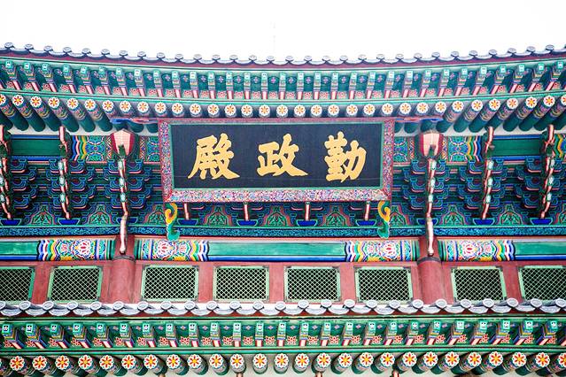 勤政殿作为景福宫的主殿,是韩国古代最大的木结构建筑物,最雄伟壮丽,是举行正式仪式以及接受百官朝贺的大殿。高宗同治六年(1867年),勤政殿由兴宣大院君重建,在花纹华丽的两坛月台上,冠以两层重檐,显得雄伟壮观。殿内有宝座和藻井,殿身四周绕以回廊,殿前铺平石板,此外,配色华丽的丹青,造型秀丽的藻井,使建筑更为庄严肃穆,异常壮丽。殿前方的广场就是百官朝会之地,广场的地面铺以花岗岩,分三条道路。中间的道路稍高、稍宽,是国王走的路,两侧的稍低一些,是文武百官走的路。还有品阶石分列于广场两侧。
