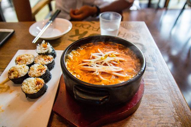 首尔的最后一餐选择了在林荫路路口的SCHOOL FOOD吃,一家改良版的韩式餐厅,TA上查看了下评价很不错。里面布置挺时尚的赶脚,菜品味道也不错,缺点就是肖总能吃的东西非常少。。。基本都含猪肉。所以基本上就是他在看着我吃。