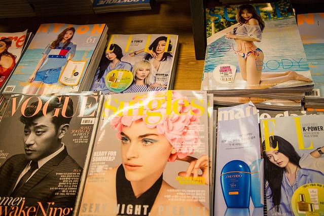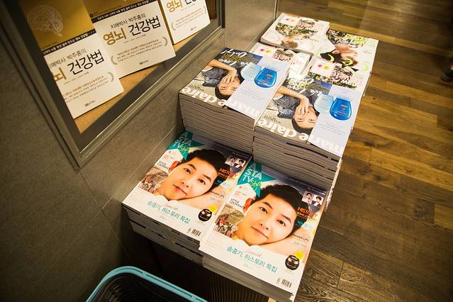 如果说非要在书店里买点书籍类产品的话,我选择了杂志区,来上一本充斥帅帅美美照片的杂志,学习最流行的韩国时尚。从杂志封面页能看出现在韩国明星的流行指数,仲基欧巴绝对当仁不让的No.1。