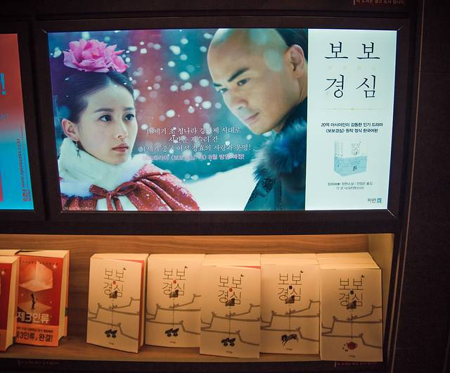 书店里书虽然咱们看不懂,但是这熟悉的海报还能不认识,连肖总都跟我说,诶诶诶,这不是八爷吗。可是我是四爷党啊。最近韩国版的步步惊心马上就要开始播映了,估计也是这个关系,这本书被摆在了显眼的位置,看来销量不错。作为一本我初中时期最爱的言情穿越小说,当想都有买一本回去纪念的冲动。
