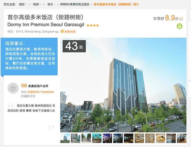我们选择的这家酒店dormy inn premium seoul garosugil,位置绝佳,紧邻地铁新沙站,距离林荫路不到10分钟步行,价格在800-1000人民币左右一晚,房间偏小,但是非常干净、设施很新,酒店的早餐非常非常丰富,中、日、韩、欧式各种,味道也很惊艳,地下一层油免费的桑拿,还有免费的宵夜。5星推荐。