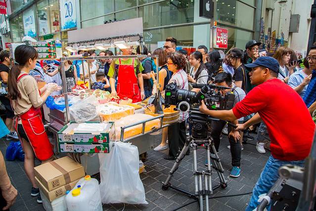 韩国似乎也挺流行美食节目,挺多摊位旁边挂着上过电视节目的证明照片,这不,不知道哪个节目正在拍摄呢。