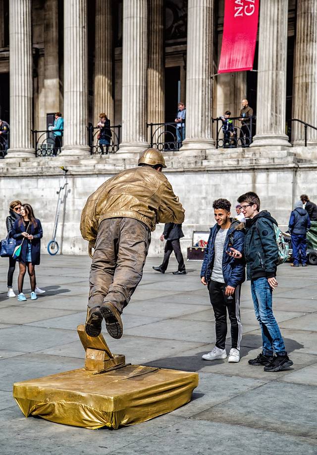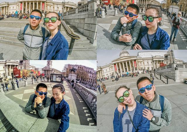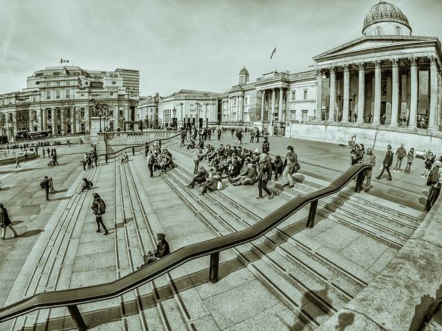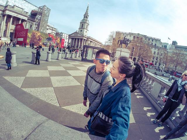 从国家美术馆的后面绕来,可以到达特拉法加广场,广场中央是为了纪念英国海军纳尔逊将军所建的石柱,下方有四只威坐的雄狮塑像,柱基为青铜浮雕,反映了1805年英国海军战胜法国海军的场面。这个广场经常聚集大量的鸽子,所以又叫“鸽子广场”,当我坐在石阶上的时候,我也在思索,当年传说梁朝伟来伦敦为鸽子的故事,会不会说的就是这里呢。