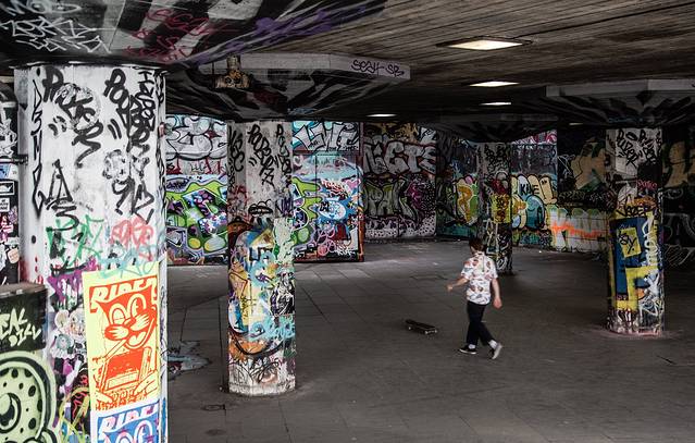 沿着泰晤士河走,一个下沉的涂鸦广场,几个人玩着滑板,和周遭举着相机的游客们显得格格不入。尤其,对于一个初到英国的我来说,我印象里的英国男人应该是西装皮鞋,领带帽子。