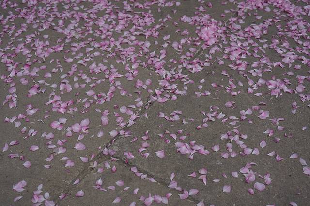 喜欢这棵树是因为花瓣落满地,有一层淡淡的粉色,因为是在角落里,所以满地的花瓣并没有被破坏掉,仍然保持着当初落下的样子。