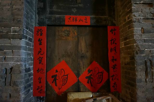 看到门上那个福字了嘛,超有意思的,中间其实是个寿星公,右面还有“寿星”两个字,这些春联肯定都是手写的,很有感觉呀