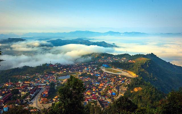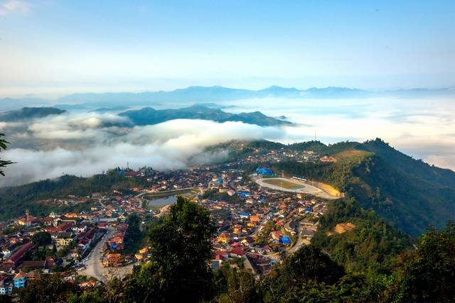 丰沙里镇坐落在海拔1700米的高山上,随着温度升高,云雾慢慢弥散,连绵的山脉露出了它顶端的轮廓,小镇也露出了它的真貌。