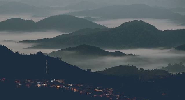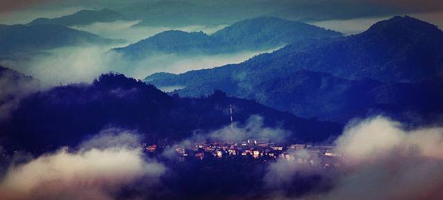 云雾从深不可测的低谷里爬上来,悄悄没过了小镇上几只孤寂的红屋顶。彷佛,天空中有一只妈妈的手,在清冷的黎明中,她为小镇盖上了一层厚厚的棉被,拍打着他的肩背,轻轻地说:天还没亮,再睡一会儿吧,宝贝。
