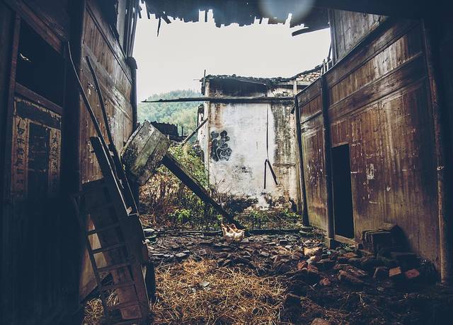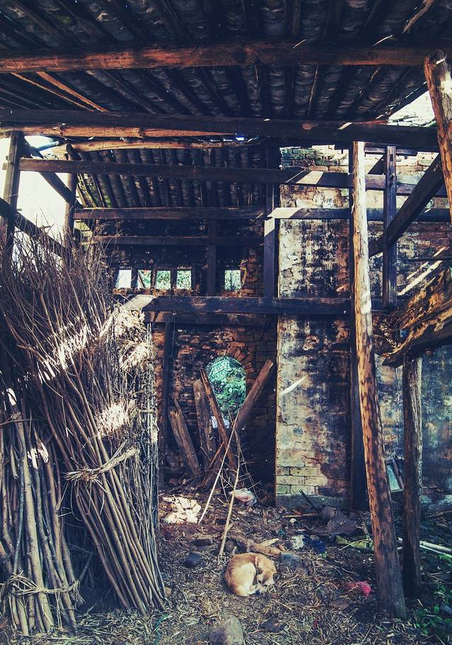 当他乡地面上的篝火撩得正旺,一座座被遗弃的家园中,时代的标语,昔日的祝福还贴在墙上,他们一起,伴随着一场场单调的冷雨,腐烂、坍塌,正在被大自然慢慢地回收。