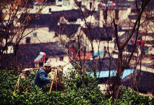 高山上是梯田,亦是茶园。高树上的叶子落光了,漫山的茶树依然青绿。