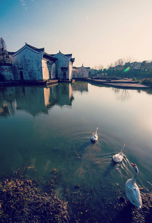 小桥的另一边,白墙灰瓦外的水边,几只“见过世面”的白鹅丝毫不会被我的脚步惊扰,它们稳稳地排成一排,金色的斜阳穿透了它们雪白的羽毛。