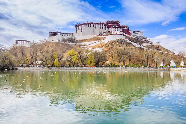 其实拉萨的天气也非常的多变,时阴时雨,时风时雪,所以如果来到拉萨也未能见到布宫的真容也不足为奇,一切全靠缘分,好在第二天是个大晴天,于是神秘的拉萨探索之旅便开启了。与酒店咫尺之遥的宗角禄康公园便是最近的入口,园中的湖面尽是各种珍稀禽类、野鸭和鸳鸯,自然与建筑的完美融合可见一斑。