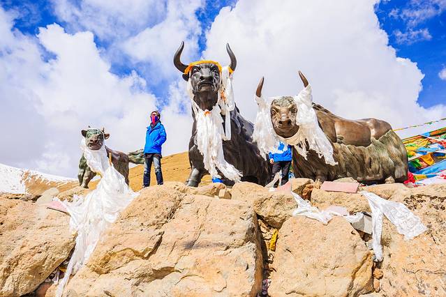 高大雄奇的米拉山在藏民心目中是一座“神人山”。山口上挂着大片壮观的风马旗,地上遍布着抛洒的印有经文的隆达纸。在山口处,矗立着一座标有“雪域之舟”的西藏耗牛石雕像,显眼的雕像是米拉山唯一的标志性建筑。