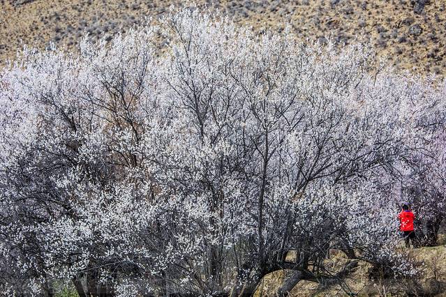 路边的山坡上,生长着大片的桃林,成百上千棵桃树虽然不成行列、随意错落,但都可着劲儿绽放着各自美丽的花朵,或雪白、或粉红、或淡紫,如火如荼,如梦如幻,共同装点着高原的春天,争相演译着春天的浪漫。