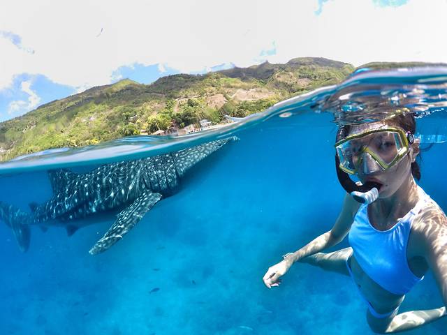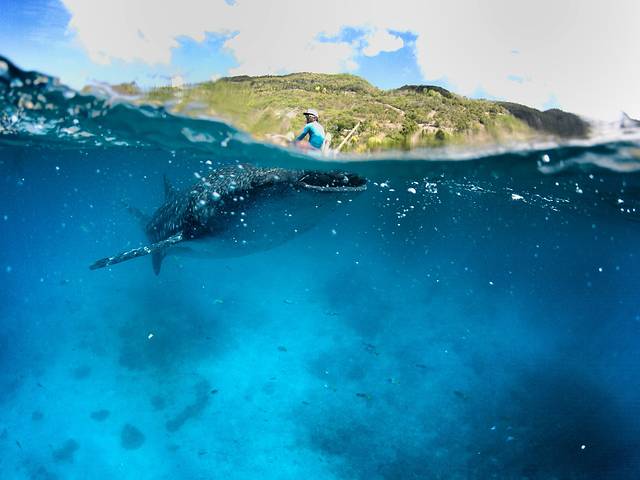早上的鲸鲨数量比较多,3、4只是有的,当这个庞然大物出现在面前的时候完全不会害怕,只想亲近它。就在我追着其中一只游的时候,突然被背后来的一只撞到,本来是不给摸的,但是它主动撞到我,真是觉得自己有够幸运啦!
